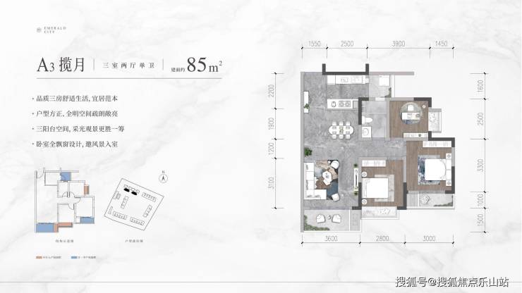 85 ㎡,2T4 三室两厅单卫 南北朝向,全飘窗设计,厨房连通生活阳台可达约 4.5 米进深,8.4 米竖厅进深,连通观景阳台 达 9.9 米,最大可享 35.64m²起居空间,三房三阳台,全飘窗功能三房,视野进阔,采光通透。