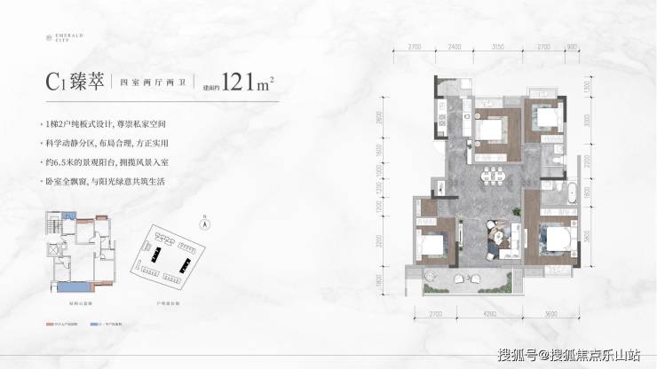 121 ㎡,1T2 四室两厅双卫 厨房连通生活阳台,达 3.9 米进深,三房带飘窗,次卧连接景观阳台,四房皆享通透采光观景, 6.9m×1.8m 阳台,奢阔视野面。