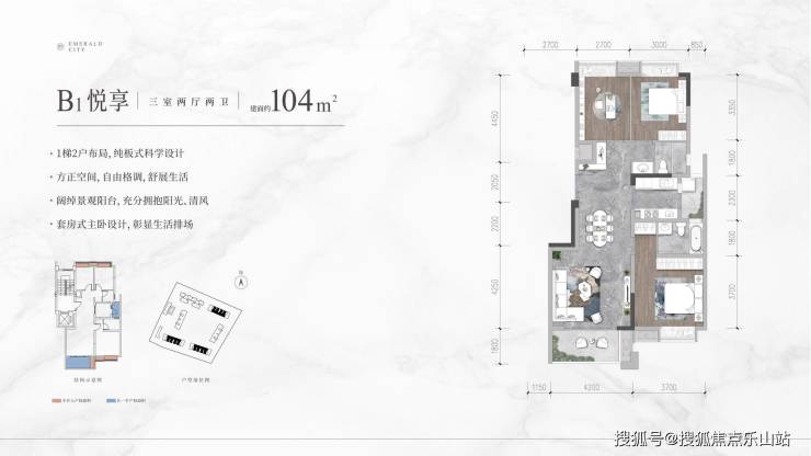 104 ㎡,1T2 三室两厅双卫 全飘窗功能三房,视野进阔,采光通透,入户横轴 9.6 米,连通阳台 11.4 米,纯板式结构,通透 采光,主卧 20.35m²套房设计,带独立卫浴,1.8m×4.2m 阳台面积,大进深灵活空间布局。