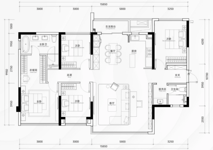 建面约174㎡(四房):双面观景,南向面宽约15.8m,LDKG一体化方厅,主卧套间约30㎡;
