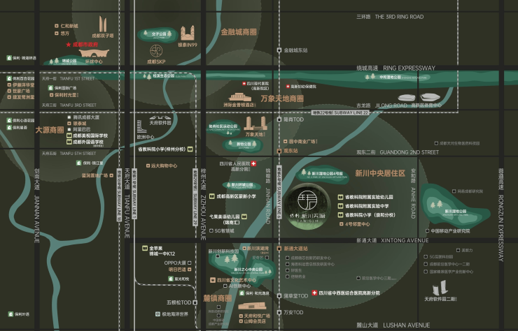 ▍繁华天赋之地 三大醇熟商圈约3KM内新川潮奢生活圈:西南首个万象天地(建设中)、文艺潮流MALL明日巴适、蓝润置地广场、远大购物中心等,畅享24H生活场景;约7KM内金融城商圈、环球商圈:银泰IN99、悠方购物中心、仁和新城购物中心、环球中心、SKP等,万象缤纷生活。