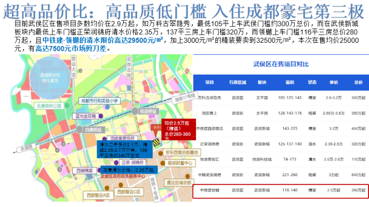 【项目数据参数】🔷开发商:武侯资本X中国铁建地产🔷容积率:2.0🔷总户数:806户🔷在售楼栋:东地块1# 6# 1号块1# 3#🔷物业类型:纯住宅/纯洋房🔷建筑高度:7~13层🔷占地面积:约77亩(46+31亩)🔷户型区间:约116㎡三房/140㎡四房🔷总价:116㎡300万左右 140㎡360万左右🔷交付标准:精装(标准2999元/㎡)🔷交房时间:2026年3月(具体以合同为准)🔷户型结构:正南北朝向板式/2梯2户🔷入户方式:电梯独立入户,赠光厅入户厅🔷物业公司:华润置地物业 物业费:3.7元/㎡🔷地铁配套:四大TOD(白佛桥 双凤桥 机投桥 武青南路)+5条地铁(3/9/17/29/33号线)