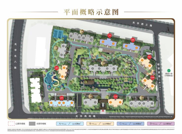 仅556户,楼间距140-195米,3万㎡中庭园林,外光华罕见。