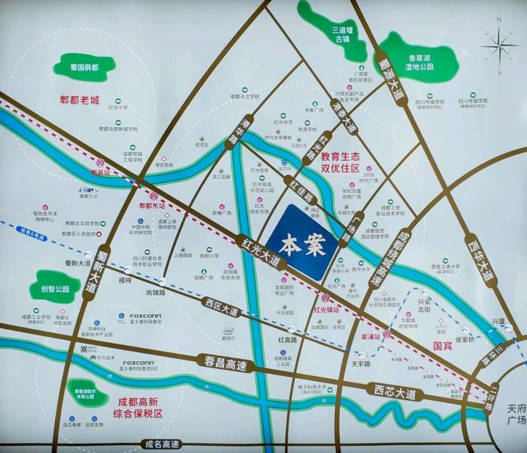 ✈️教育 :学府环绕公立幼儿园:幸福路幼儿园(1km)红光街道示范幼儿园(200m)公立中小学:红光学府小学,思源学校,红光中学成都天立学校:私立k12教育,距离本项目约2km左右