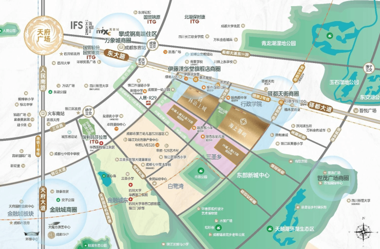 中心,在城市东西主轴东大街之上,承载锦江主城功能,目前是成都东唯一可进行大规模产城开发的区域,通过政策托举、资金流入、产业聚集、人才汇集,催生高端住区的快速成型。