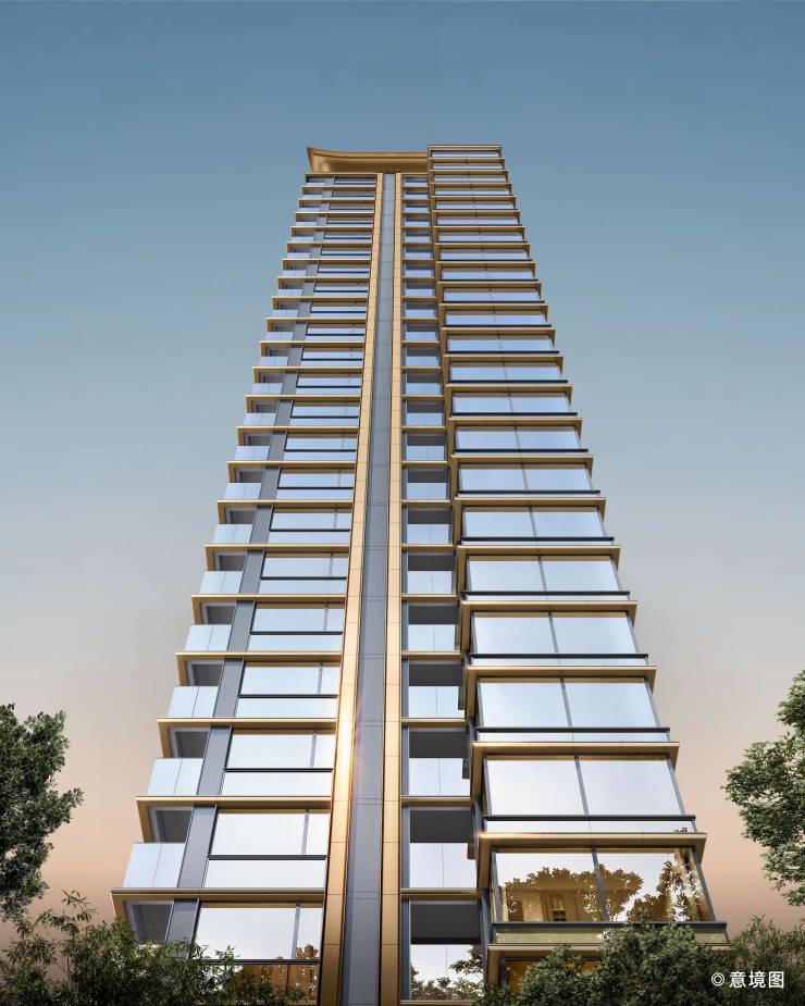 立面:香槟金铝板+仿石漆,窗墙比达0.4,对标天字系顶豪标准。