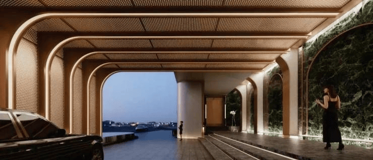▌形制之琢磨 » 温润曲柔如玉,270°寰宇全景舱建筑通体以全弧线包裹,隐匿每一处棱角,尽显温润如玉般的柔和之美;立面采用全景落地曲面玻窗,客餐厅与主卧实现270°环幕式观景面;主入口拱形门以及社区大量卷拱运用,演绎海派建筑之美。