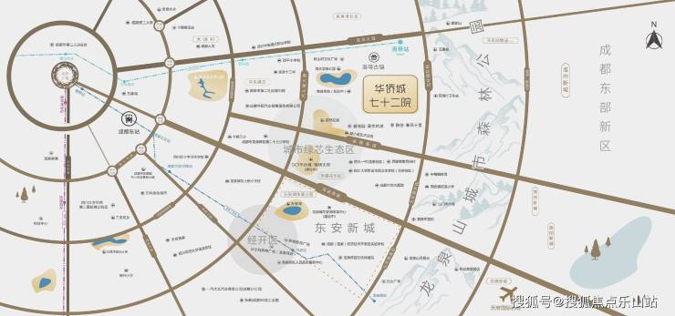 洛带华侨城·七十二院,东邻龙泉山城市森林公园,北接洛带古镇4A级景区,西毗邻洛水湿地公园,南望千亩蔚然花海。
