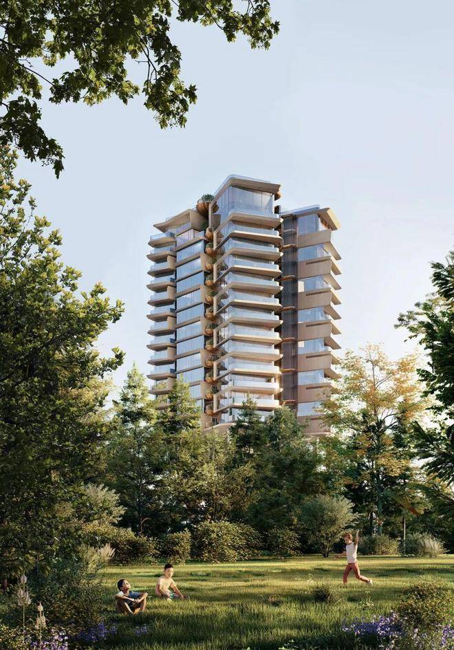 架空层全面打开:外立面的可见设计维度零涂料,采用UHPC、蜂窝铝板、三玻两腔LOW-E三银镀膜玻璃、YKK阳台电动推拉门等地标级材料,同时将中心花园向外出挑,打造历久弥新的垂直生态建筑。