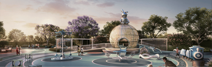 ◎2大融景泛会所-童梦泛会所/长者泛会所延伸出的半室外休闲空间,趣味雕塑、儿童秋千、休憩区等