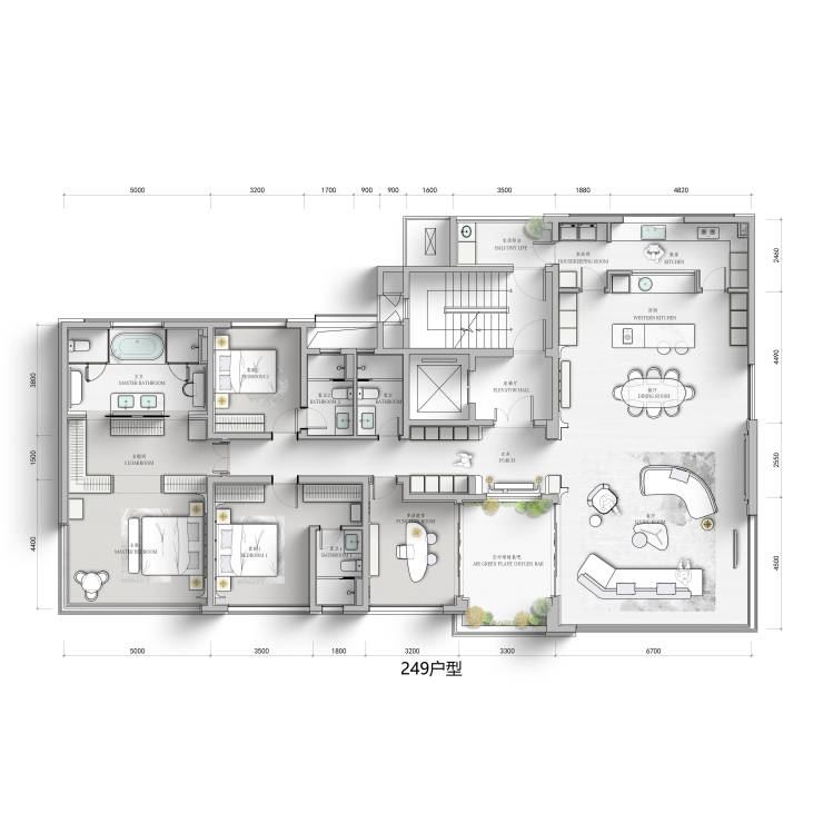 位于项目中轴线上,其中建面约 249㎡户型为一层一户配置,叠加室内超百平的私人会所式享受,彰显主人的尊贵与私密,为业主提供了宽敞舒适的居住空间和高端的生活体验。