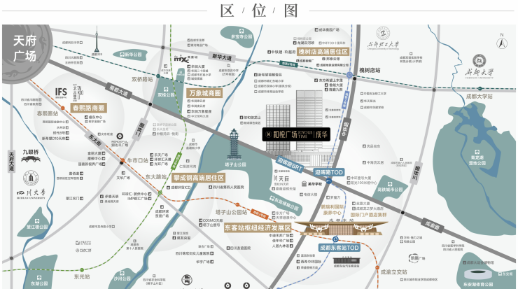 项目地处太古里、万象城、东客站三大商圈核芯位置,享受东客站枢纽站点带来的磅礴人气,同时吸附万象城商圈庞大的高端消费人群,以及太古里商圈商业能级的加持。未来将与太古里、万象城形成主城商业黄金三角,并能辐射十陵、青龙湖与成渝立交片区,是城市东西主轴线上又一冉冉升起的超级商业综合体。