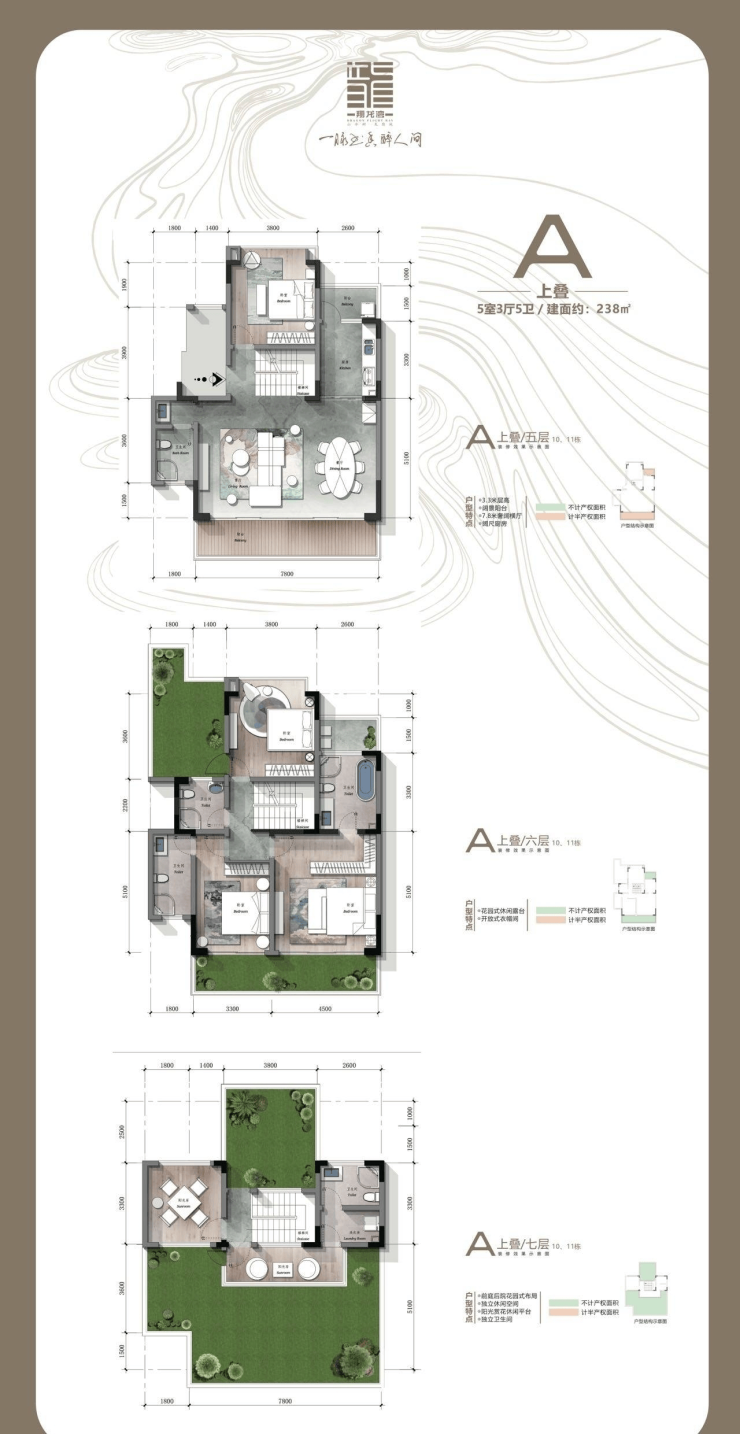 235㎡:四室三厅四卫,南北双庭院,独立家政电梯厅