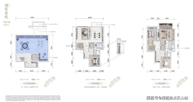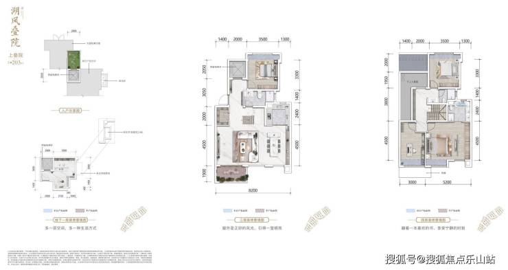 两叠下叠225㎡:独门院落,前庭可直接花园入户,与客厅相连,后院与老人房连通,老人独立使用。