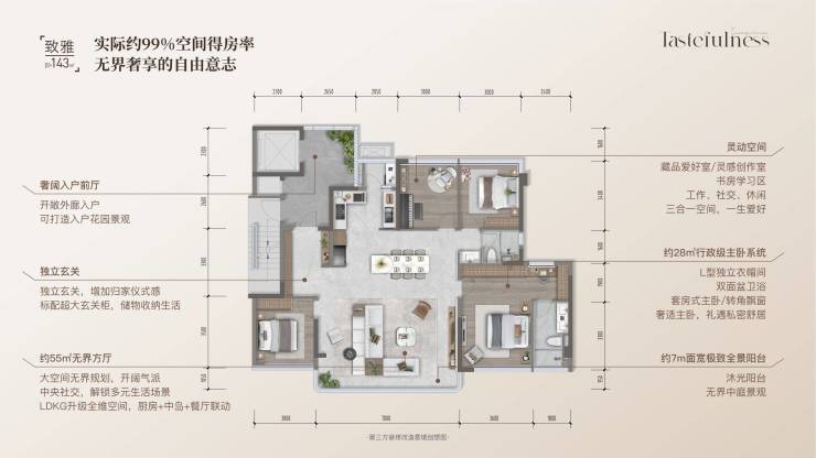 户型亮点:约99%超高得房率,143㎡的面积,悦享180㎡的尺度,约15米朝南采光面,光感无界奢享;约56㎡的大方厅,幻变多功能空间,舒展丰富场景