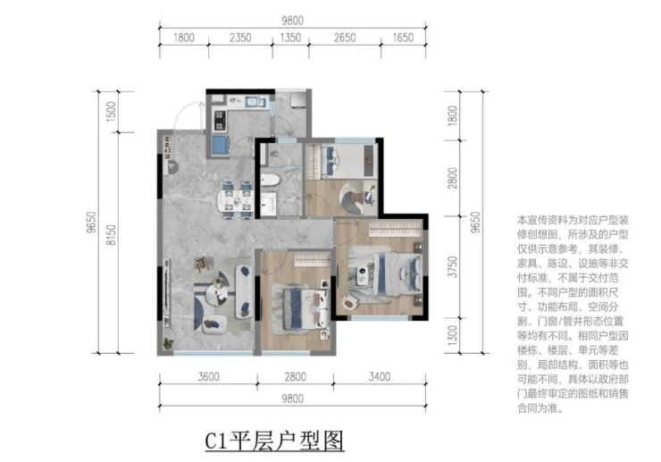 建面约98㎡三房双卫: