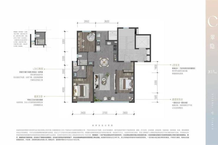 LDKB一体化方厅,客卧双联阳台,U型厨房,强化空间通透性与实用性。