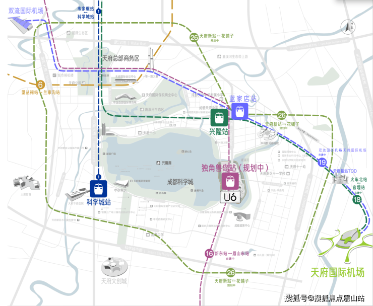 18号线兴隆站(约500米)、16号线成都科创生态岛站(规划中)、19号线蓝家店站(约1.2公里)、天府新站(在建,约2公里)。