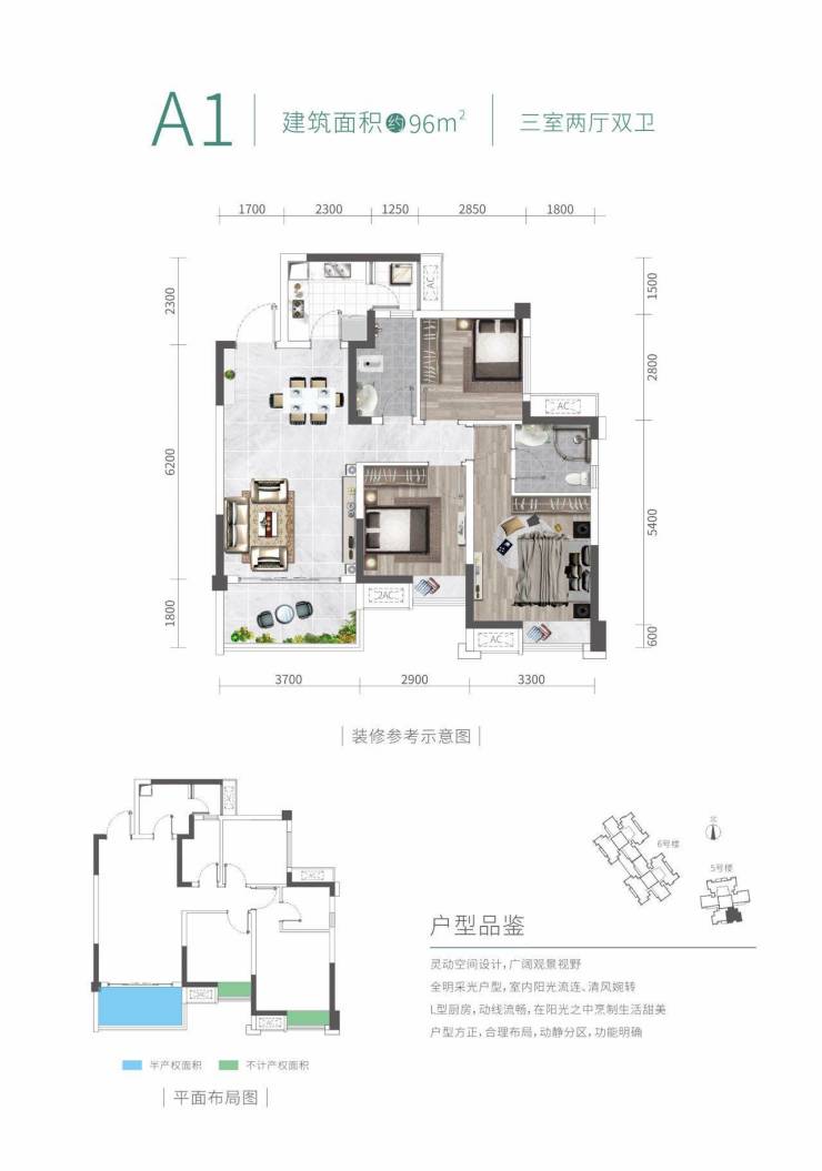 96㎡三房:L型厨房+全明户型