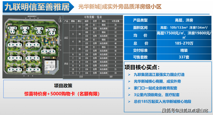 【项目参数】楼层:洋房7-10层、高层20-26层,面积段:约109㎡-134㎡,绿化率:30%,容积率:2.5,总户数:619户,梯户比:洋房1T2户、高层2T4户,在售楼栋:高层2 3 4 5 栋,洋房6 7 9 11栋,交房时间:2024年6月低层高:3.15米,装修情况:高层精装两大件 洋房精装三大家