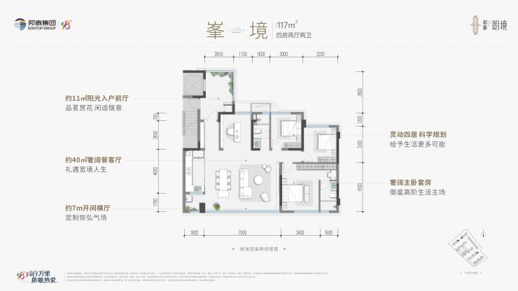 •建面约117㎡ 峯境 四室两厅双卫(清水)阳光前厅私梯入户,灵动四居,奢阔主卧套房