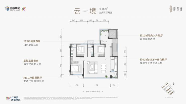 •建面约104㎡ 云境 三室两厅双卫(清水)2T2户纯板式布局,约11㎡阳光前厅私梯入户,约7.1m开间巨幕横厅,星级主卧套房