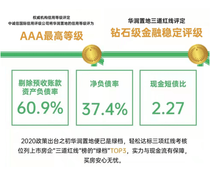 ▶华润置地,布局境内外城市84个,中国内地开发商TOP10,香港恒生可持续发展指数成份股TOP30,轻资产管理第1品牌。2021年房企评级中,华润置地最新信用评级AAA最高级、金融稳定评级钻石级稳定、负债率三道红线考核全面“绿档”,华润品牌实力保障。