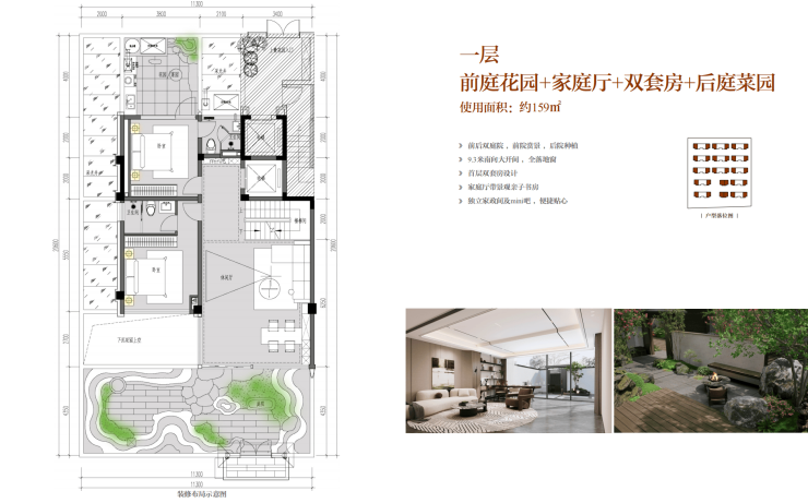 花园面积约72㎡(前厅花园约40㎡+下沉花园约17㎡+后庭花园约15㎡)