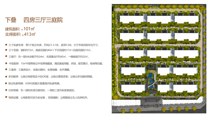 建面约101㎡,实得413㎡,带3个独立车库