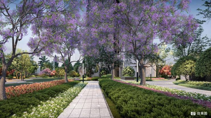 【三重景观园林,续写生活故事】项目匠心设计,打造了三大主题园林乌桕林下斑驳树荫,打造出拾光会客厅春华秋实果木园,孩子天然成长识物好去处蓝花楹树阵,连接前庭后院美景,浪漫满楹同时利用场地建立多维度立体景观生态