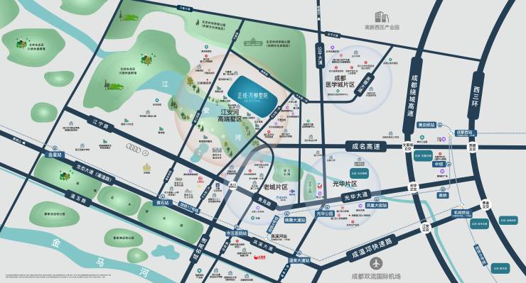 一高一铁两快速,畅联主城生活圈· 成温邛高速路,快速到达市中心及天府广场 · 地铁17号线,无缝衔接市中心及双流机场 · 光华大道快速路、凤溪大道,快速出行