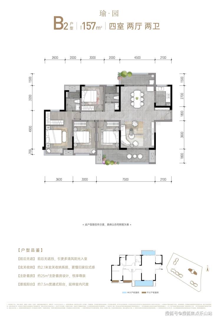 和悦府176㎡大平层:2T2梯户比,7米观景阳台,主卧套房式布局。