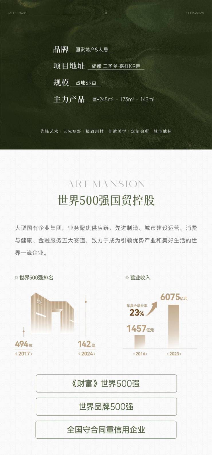 国贸人居TOP系作品——启樾天玺落子三圣乡高端住区,首推245㎡艺术大平层,直线距离华熙LIVE·528商圈1.2公里,以2925元/㎡精装标准打造"藏馆级"居住空间,2027年准现房交付。
