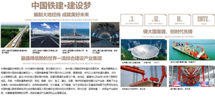 中国铁建前身为中国人民解放军铁道兵,2007年成立中国铁建股份有限公司,2008年在香港上市,目前在全国44个城市、9个国家级新区以及海外(莫斯科)布局219项目,2021年《财富》“世界500强企业”排名第42位、“全球250家最大承包商”排名第3位、并拥有4大奇迹作品,380天竣工人民大会堂,成昆铁路,世界第一条磁悬浮商业运营线,青藏铁路,中国铁建是全球最具实力、规模的特大型综合建设集团之一