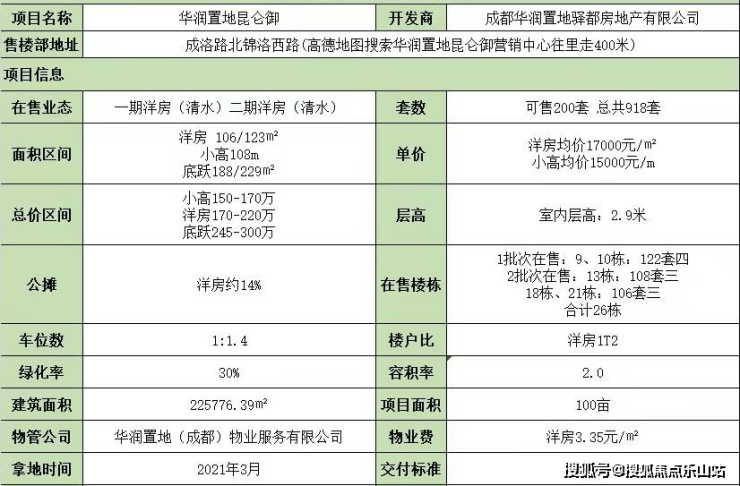 项目信息:在售面积:108m²小高、106-123m²,洋房,在售均价:小高1.5万/m²、洋房1.7万/m²,在售总价:小高150-170万、洋房170-220万,公摊:约14%,绿化率:30%,容积率:2.0,建筑面积:225776.39m²,占地面积:100亩,物业公司:华润物业,交付标准:清水交付,时间:1号地块 2023年12月2号地块 2024年6月,开发商:成都华润置地驿都都房地产有限公司