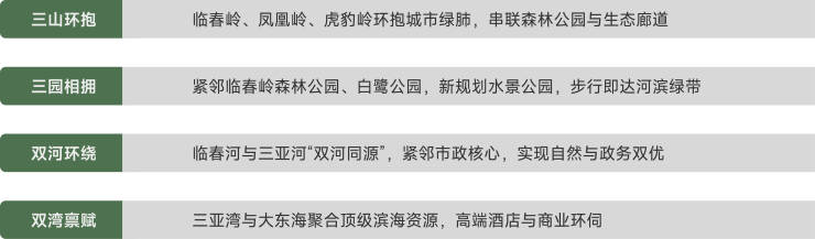 •文体:规划综合性文化场馆,融合近山书院人文底蕴,距三亚图书馆约1km,约4公里直达邮轮母港与游艇消费区