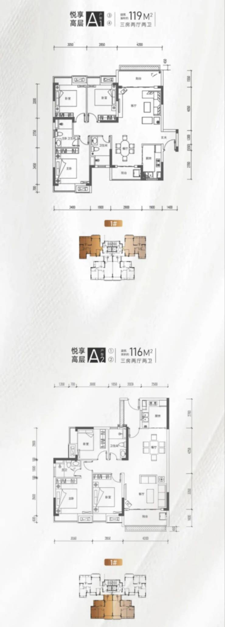 在售户型:建筑面积约99-100㎡三房两厅一卫、约116-119㎡三房两厅两卫