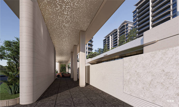 •一进:酒店式归家 | 近 70 米长弧形落客门廊,围合仪式感入口前院