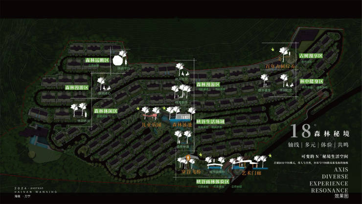 借鉴六善酒店、巴厘岛等高奢度假酒店景观巧思,以“居山观海,极致视野”的设计理念,“一主两次轴线,七大景观核心区,八大自然场景”造景格局,诠释隐林山涧的隐奢秘境。