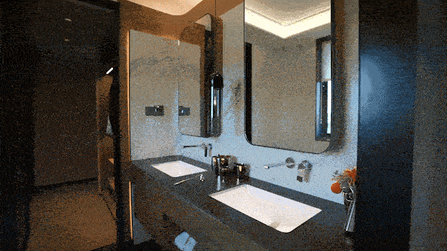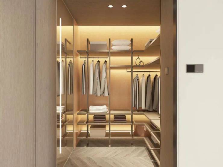 独立卫浴空间,借鉴了高端酒店的设计风格,采用相互独立的双台盆设计,彼此陪伴但又保持适度的距离。贴心配置智能浴缸,当夜幕降临之时,浴缸里来一次身心浸泡,静静眺望窗外的夜色,享受属于自己的片刻时光。淋浴房设计,摈弃臃肿挡水条,极窄边框的玻璃隔断,实现了空间通透感的最大化。严选天然石材墙面,淋浴屏地面抽槽工艺,每一个细节都沉淀着对精致生活的巧思。