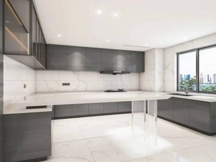白色石膏板吊顶内嵌东芝中央空调、预留双开门冰箱位、吊柜嵌入式灯光等细节设计,映射出高品质的生活方式。