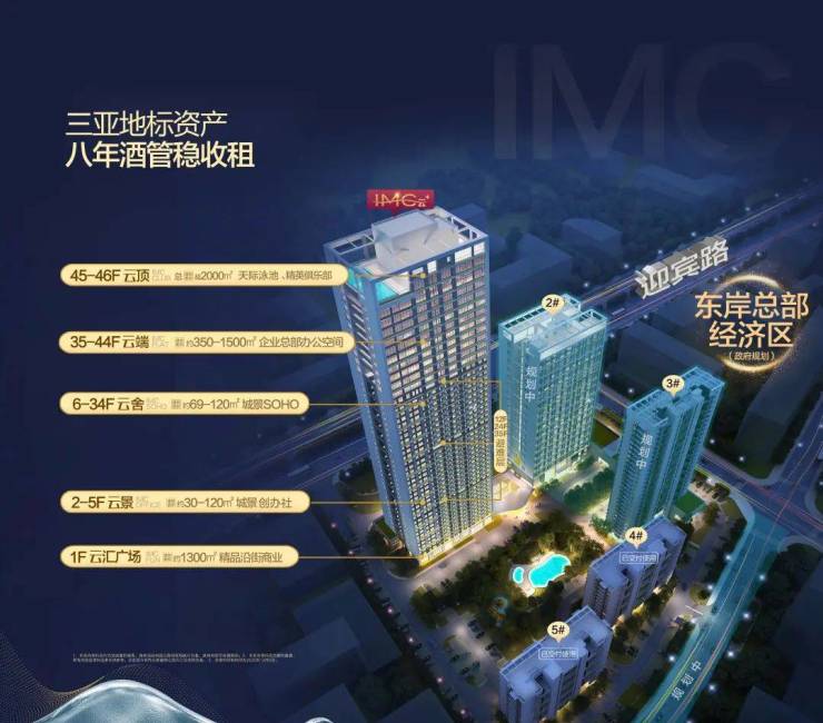 三亚国际传媒中心位于三亚主轴迎宾路,眦邻东岸单元总部经济区,目前已有10家世界500强落子于此。IMC云+总高度约170米的超高地标建筑,涵盖奢享酒店(规划中)、精英俱乐部、阔景平层、城景SOHO、精品沿街商业等多元业态的垂直综合体。