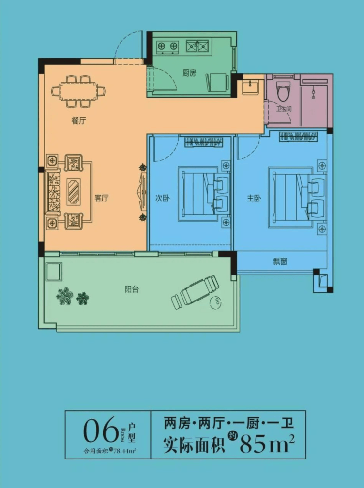 02、03户型:两房两厅一卫,三面都是朝景观面,5.8✖2.4的大阳台,客厅开间3.4米
