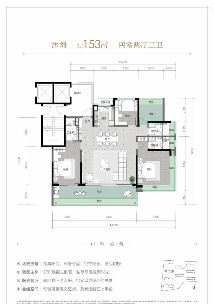 规划建筑面积约126-213㎡观海奢装大平层,约3.1米阔绰层高,部分户型创新设计270°全景飘窗主卧套。