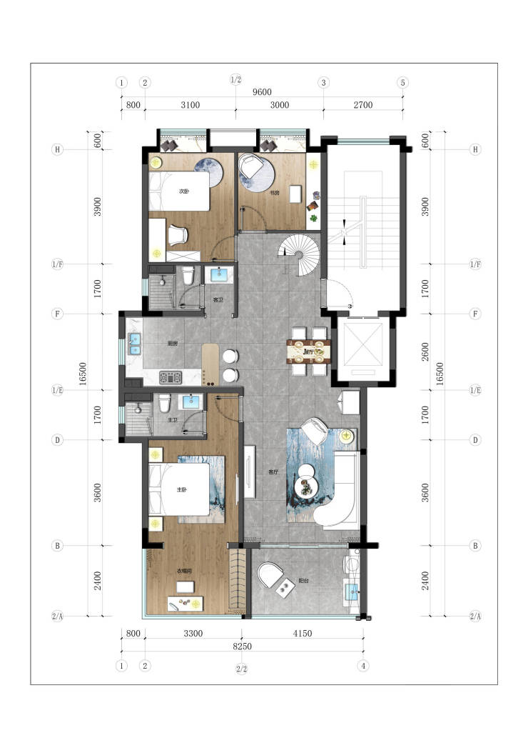 2.上叠:建筑面积约120㎡,四房两厅三卫。