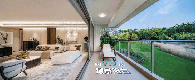 约9.9米宽瞰景阳台横跨大方厅与次卧套房,全面开启空中广角视野,这是大平层才会有的巨幕视野。
