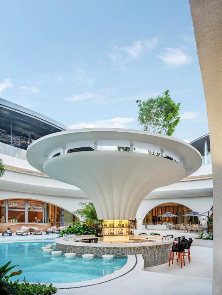 迪拜风情的社区会所——海晏艺术会所以文艺复兴时期的著名画作《维纳斯的诞生》为灵感,巧妙地将花雨艺术符号贯穿整个设计之中,成功打造了一个融合了文艺复兴韵味与自然人文氛围的独特空间。会所的外观设计采用了白色曲线拱券风格,中间穿插着泳池,蓝白相间的色彩搭配营造出一种宁静而放松的氛围。作为国内首家引入迪拜风情设计的社区会所,它不仅带来了同纬度地区的气候特点,还增添了一抹异国情调。