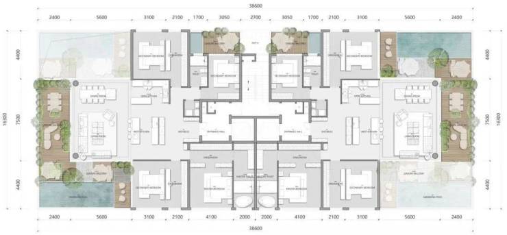 他们摒弃高低配,用不到10%的建筑密度,为园林公区留有了更多的可能性,有足够的场地将项目变成兼容酒店会所、社交场、游乐场等长期居住的旅度综合社区;低密度下,也造就了超尺度的楼间距;极低密度下,将户型面宽从楼间距和日照中释放出来。