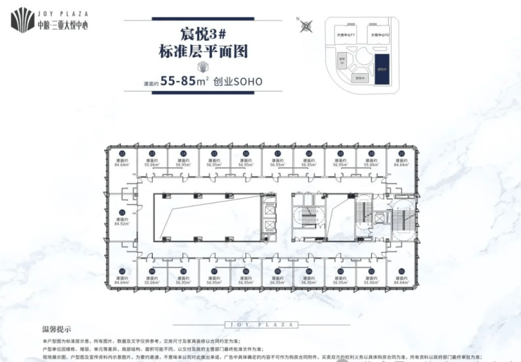 大悦中心——T3(100米写字楼)共21层,总建面约2.4万㎡,约12米建筑层高大堂,标准层高约4.2米,标准层(13-21F)建面约为1525.47㎡,分户建面约284-333㎡。