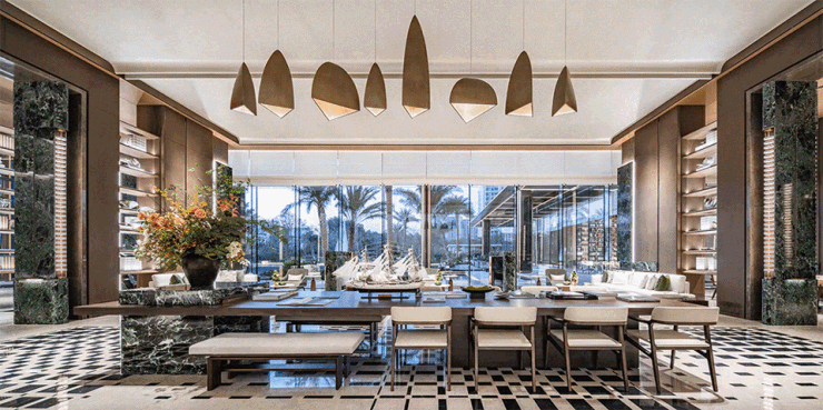 圆形顶部天花与普拉达绿地面石材、景观雕塑相呼应,不仅拉伸视觉维度更彰显出奢华感。